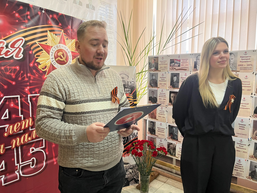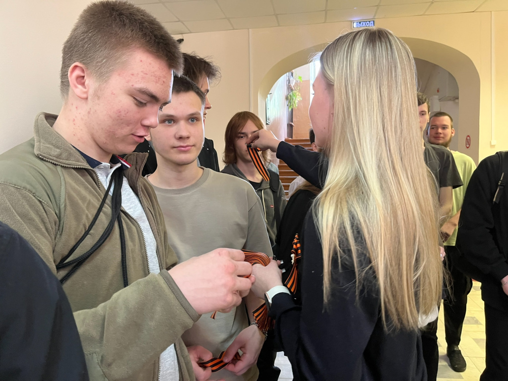 В торжественной обстановке ведущие мероприятия вручили Георгиевские ленты студентам, напомнив, что этот символ объединяет поколения и хранит в себе дух Победы.