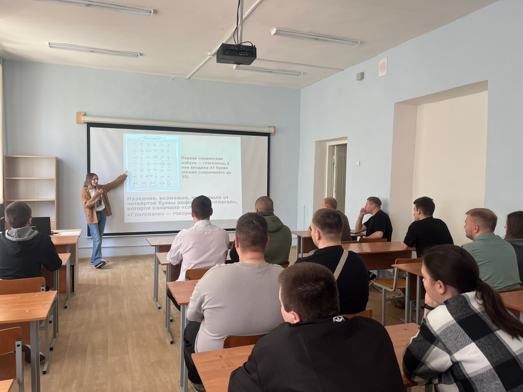 🖋️ В ходе мероприятия студенты вспомнили создателей первой славянской азбуки — просветителей Кирилла и Мефодия, познакомились с глаголицей и кириллицей, узнали об отличиях старославянского языка от древнерусского, а также поговорили о становлении русского литературного языка.