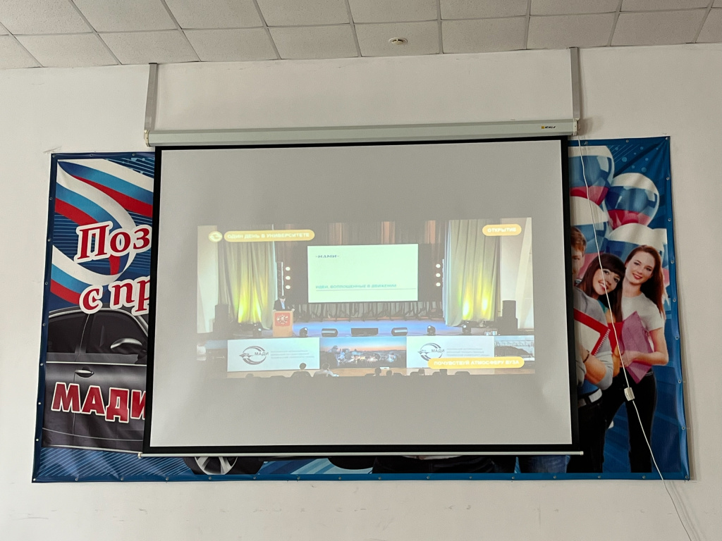 Мероприятие началось с прямого включения из головного МАДИ, где выступили ответственный секретарь приёмной комиссии Рясов С.Ю. и индустриальные партнёры университета, рассказавшие о перспективах трудоустройства выпускников.