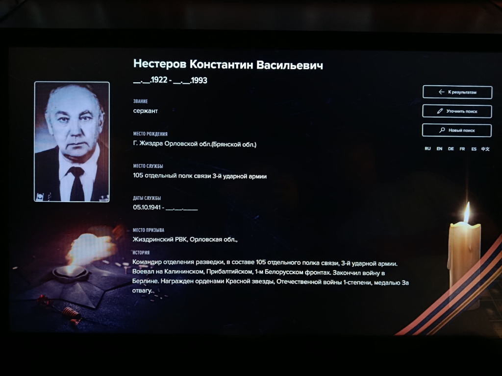 📍22 апреля во время экскурсии в Центральный парк «Патриот» студент нашёл на одном из стендов имя своего прадеда — Нестерова Константина Васильевича.