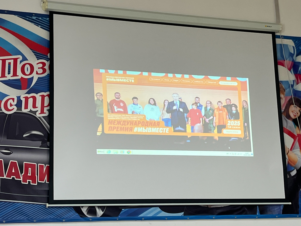 Сегодня директор Бронницкого молодежного центра «Алиби» Кашицина Ксения Вадимовна и руководитель волонтерского отряда «Волонтеры Подмосковья» Котенко Марина Сергеевна рассказали студентам Бронницкого филиала МАДИ о Международной Премии #МЫВМЕСТЕ и пригласили всех к участию!