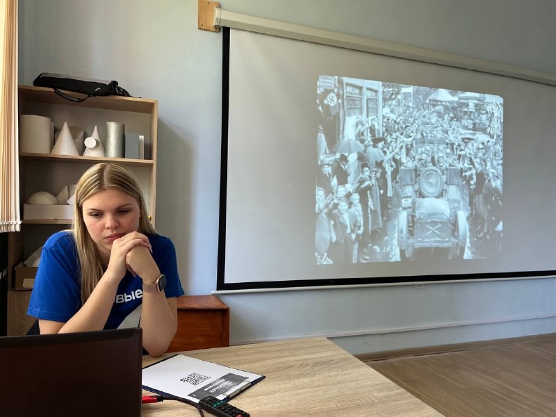 🔹Председатель Студенческого совета и Совета Первых — Гаврилина Юлия провела мероприятие для студентов первого курса, организовав просмотр документального видеоролика о фашизме. Фильм напомнил участникам о страшных страницах мировой истории, показал последствия нацистской агрессии и страдания мирного населения Европы и Советского Союза.